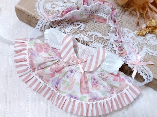 【再販】 ※現時点では、こちらの生地での再販予定はありません。 ✼┈┈┈┈┈┈┈┈┈┈┈┈┈┈┈┈┈┈✼ ✤ 商品説明 リバティプリント生地をメインに、襟・裾フリルにストライプ生地を、袖には少し透け感のあるストライプドビーレース生地を使用。 スカート部分は生地とレースの2枚重ねで、ふんわり広がります。 胸元にはリボンやレースをプラスし、お砂糖菓子のように甘くてふんわりとした雰囲気に仕上げました。 ✤商品概要 10cm無属性ぬいぐるみ向け(汎用サイズ) 『お砂糖菓子のワンピースセット さくらピンク』 ✤セット内容 ・ヘッドドレス ・ワンピース ※ぬいぐるみ本体、撮影小物等は含まれません。 ※写真はサンプルです。裁断の都合上、柄の出方に個体差が生じます。写真と柄の出方が異なる場合がございますので、予めご了承お願いいたします。 ✤仕様の詳細 ・ヘッドドレス 生地部分の長さ約14cm、巾約2.8cm。レースリボン部分片側約19cm。 レースリボン仕様で、ご自身で結んで調整していただけます。 ・ワンピース 着丈:約6.5cm(後ろ中心の上から裾まで) ワンピース後ろ全開、薄手の面ファスナー(メカニカルファスナー)仕様。 スカート部分は生地とレースの2枚重ねで、ふわふわとしたボリュームがあります。 身頃は裏地付きです。 ✤使用リバティプリント生地 ・Think of Me オールドプラム ✤着用確認済みボディ 10cm無属性ぬいぐるみ ・首まわり:約11.5~12.5cm ・腕まわり:約4.5~5.5cm ・腰まわり:約12~13cm ※サイズの近いぬいぐるみであれば種類問わず着用可能かと思いますが、綿の入り方や骨の有無などの差により着用感が異なります。 ※ぬいぐるみによっては個体差がおおきいため、すべての10cm無属性ぬいぐるみで着用できる保証はございません。必ずサイズをご確認ください。 ✤お問い合わせ ご質問などがございましたら、 お問い合わせもしくはSNSよりお気軽にご連絡ください。 ✼┈┈┈┈┈┈┈┈┈┈┈┈┈┈┈┈┈┈✼ ■デザイン・型紙・着脱について ・特定のボディだけでなく、何種類かのボディに着せられるよう、自分でデザインし、自作の型紙で制作しています。ボディにより着用イメージや着丈はそれぞれ異なります。 ■色味について ・なるべく実物の色に合わせておりますが、撮影環境による影響を受けるため完璧ではございません。 ・モニターや画面によって色の見え方が異なる場合がございます。