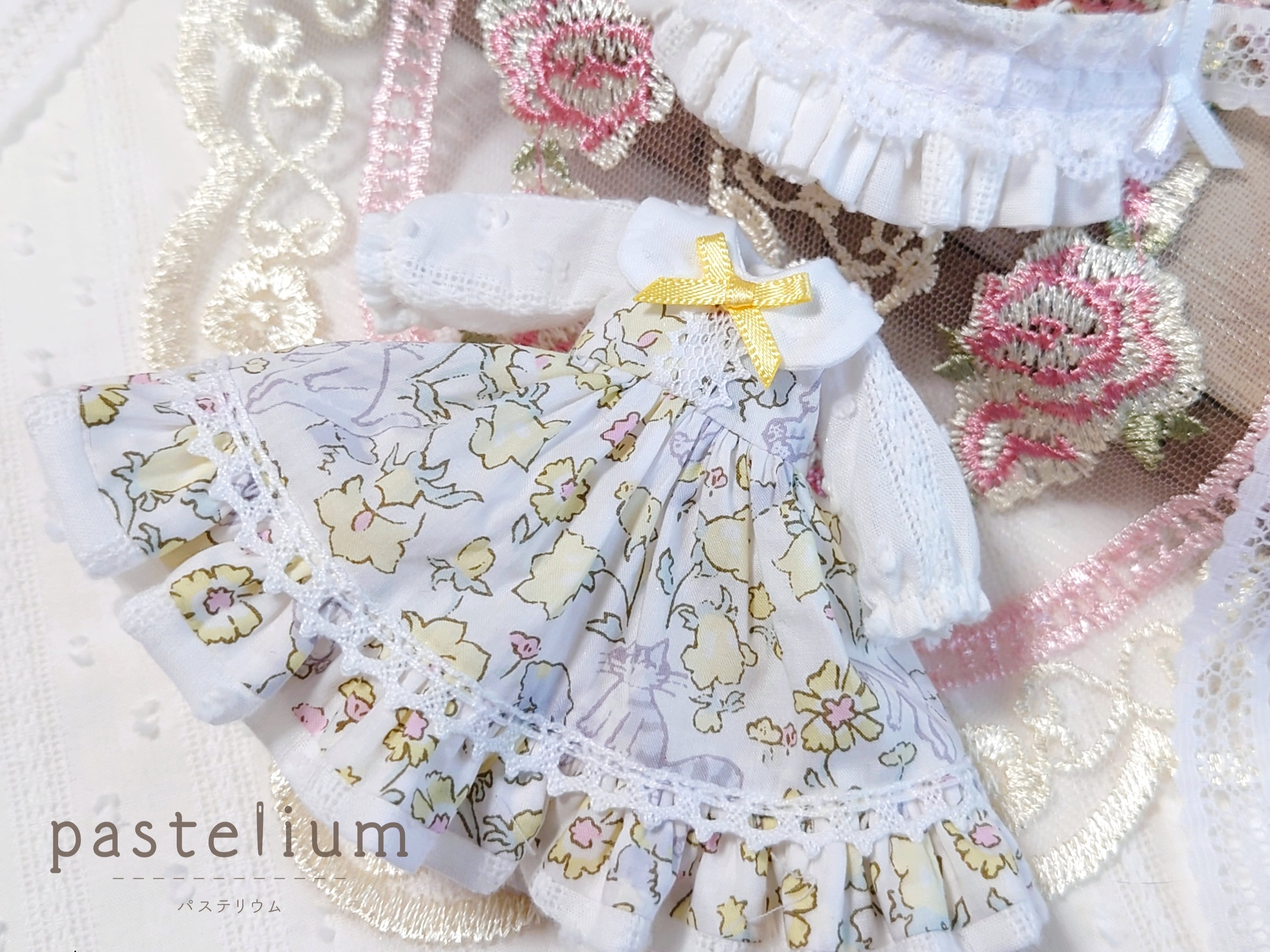 ふんわりとした色合いのお花と猫柄がかわいいリバティプリント生地をメインに、白色のポコポコとしたドットがかわいいドットミニヨン生地と、透かして織ったようなストライプが魅力的なドビー生地を使用し、やさしい雰囲気に仕上げました。